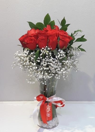 15 adet Kırmızı gül, Cibso,Silindir cam, yeşillik ve Kurdela